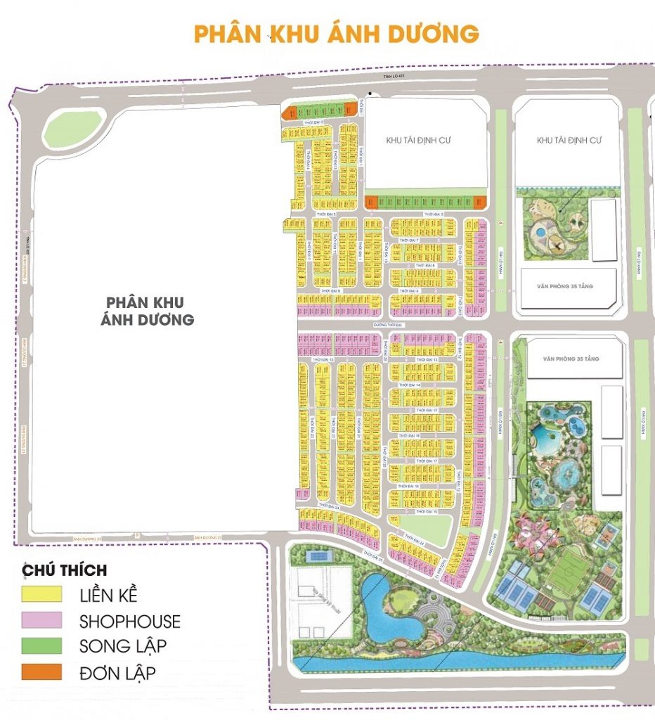 Phân khu Ánh Dương (The Light) có tổng số 729 căn, gồm đầy đủ các loại sản phẩm thấp tầng như: biệt thự đơn lập, biệt thự song lập, nhà liền kề và shophouse. Cụ thể như sau: