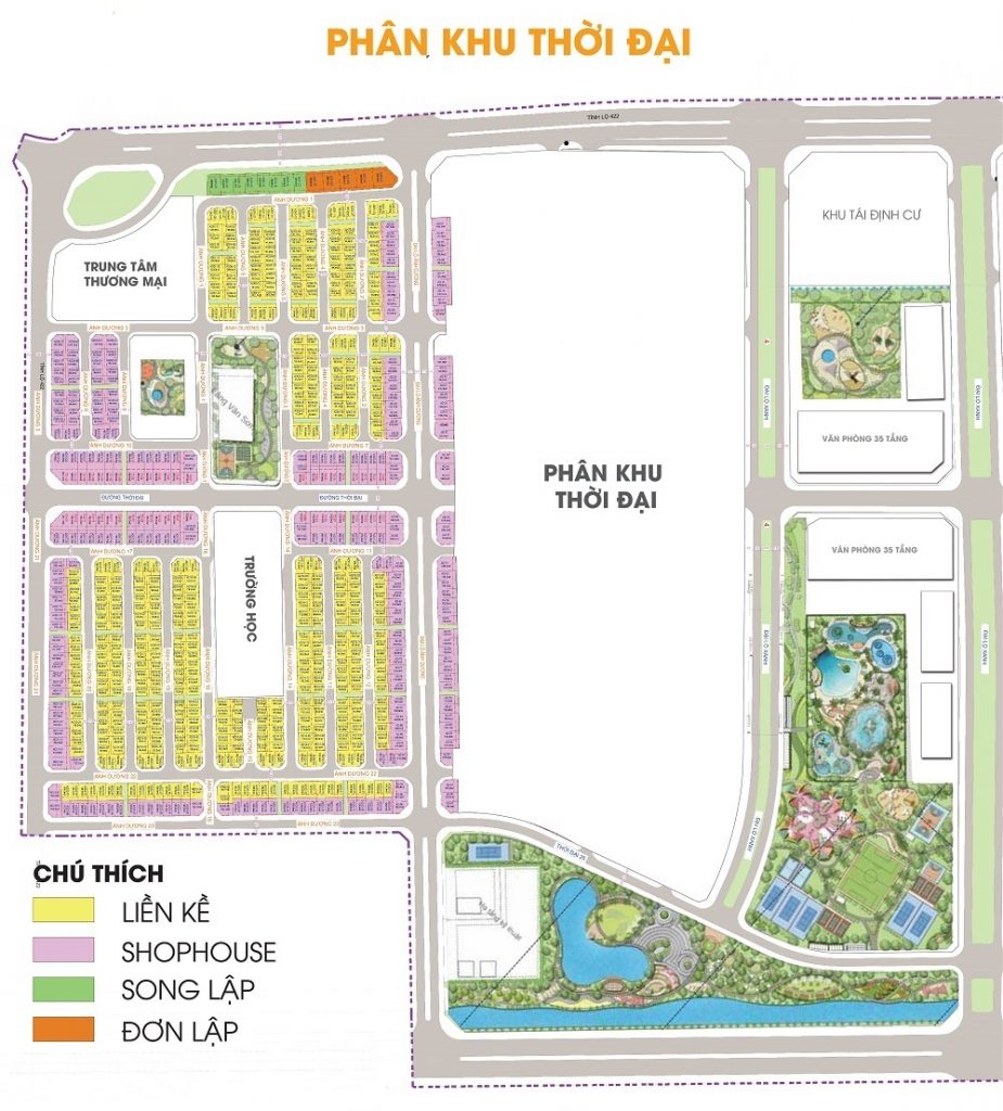 Phân khu Thời Đại (The Times) tập trung xây dựng 2 loại hình chính là: Nhà liên kề + Shophouse, cùng các loại tiện ích đa dạng. Và chỉ có 10 căn biệt thự song lập + 4 căn biệt thự đơn lập.